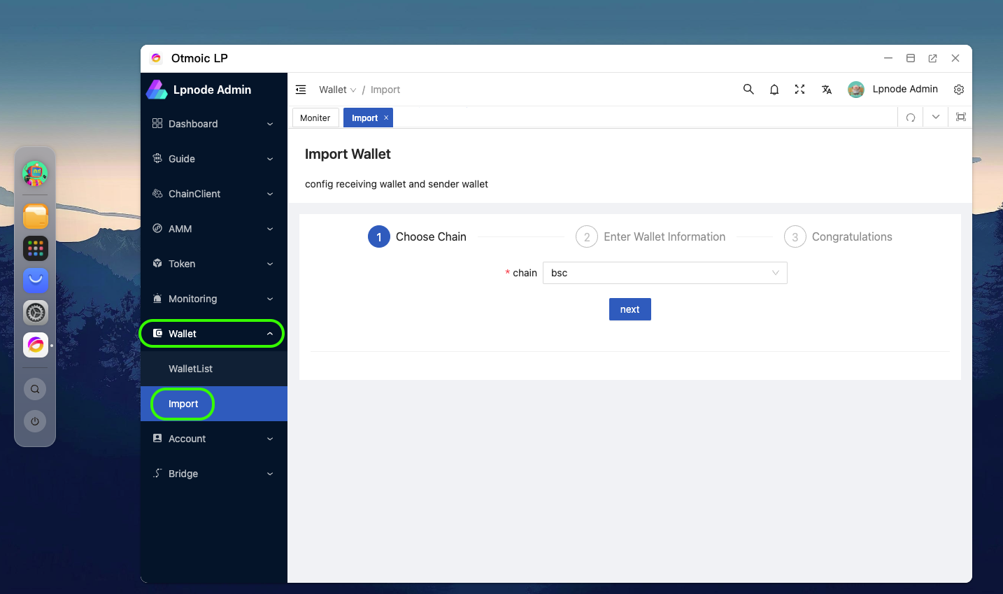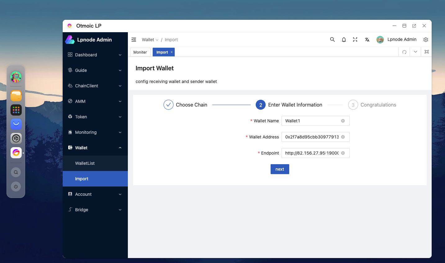 Open the Otmoic LP management page and navigate to Wallet -> Import. Then, follow the prompts to select the blockchain of the wallet, enter the wallet address, and provide the service address of the signature server, If you have followed the tutorial exactly, the entry here should be filled in as http://<signing server IP>:19000.